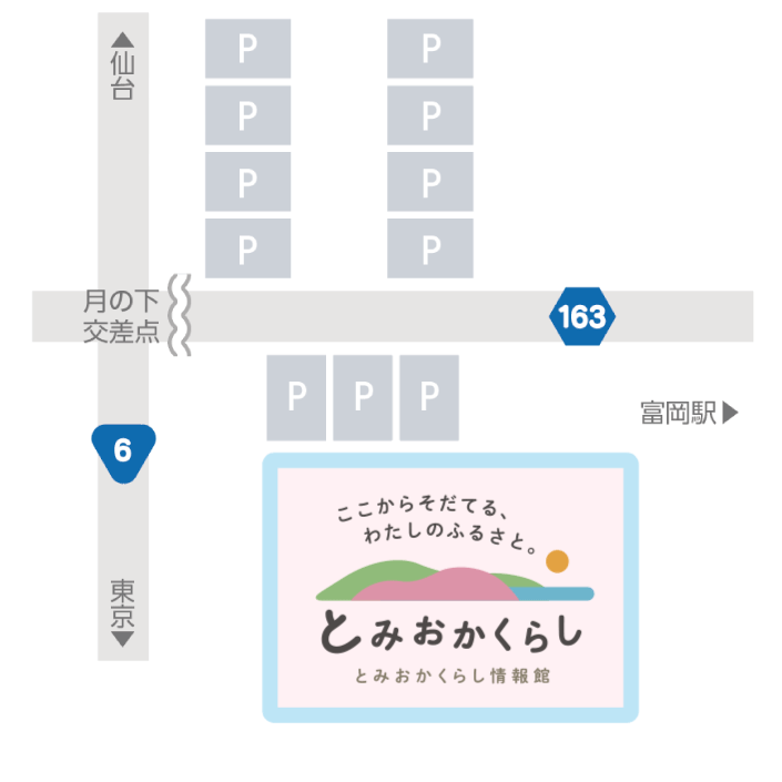 とみおかくらし情報館正面と道路を挟んだ向かい側に駐車場有