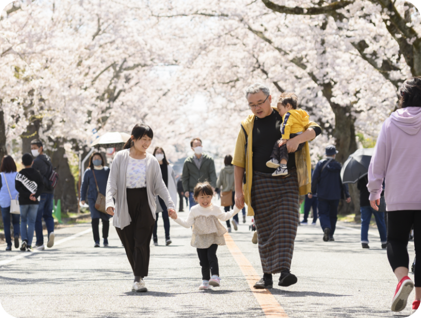 この町の象徴が、満開の桜のトンネルが空を覆う夜ノ森の桜並⽊。その歴史は、⼀⼈の開拓者が未来を夢⾒て植えた300本の桜から始まりました。
