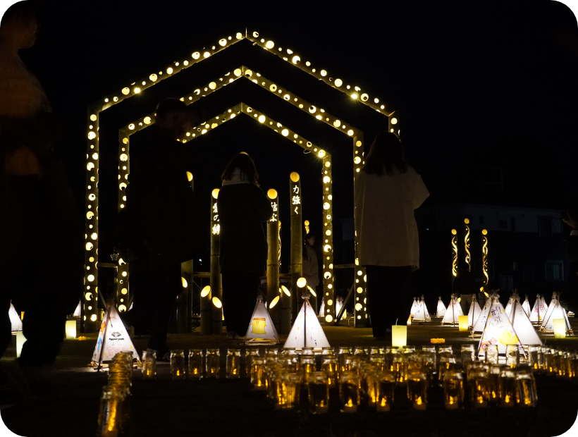 東日本大震災からの復興と、犠牲者への鎮魂の祈りを込めて始まった竹あかりのイベント。町の子どもたちやボランティアが制作した無数の竹灯籠や三角灯籠に柔らかな光が灯され、会場は幻想的な雰囲気に包まれ、未来への希望を照らします。