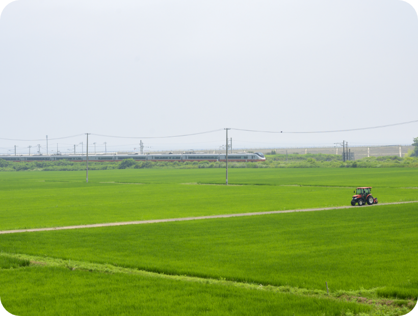富岡町の大地で育まれた「天のつぶ」や「コシヒカリ」は、町の自慢です。 黄金色に輝く田んぼの横を、常磐線の電車がゆっくりと走っていく。