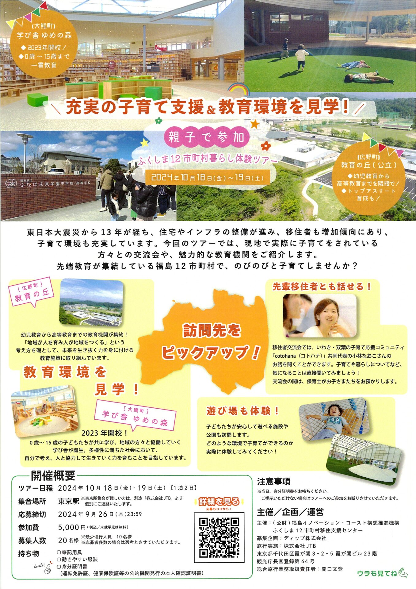 とみおかくらし情報館とも連携しているふくしま12市町村移住支援センター主催で、充実の子育て支援&教育環境を見学できる「親子で参加 ふくしま12市町村暮らし体験ツアー」が開催されます。