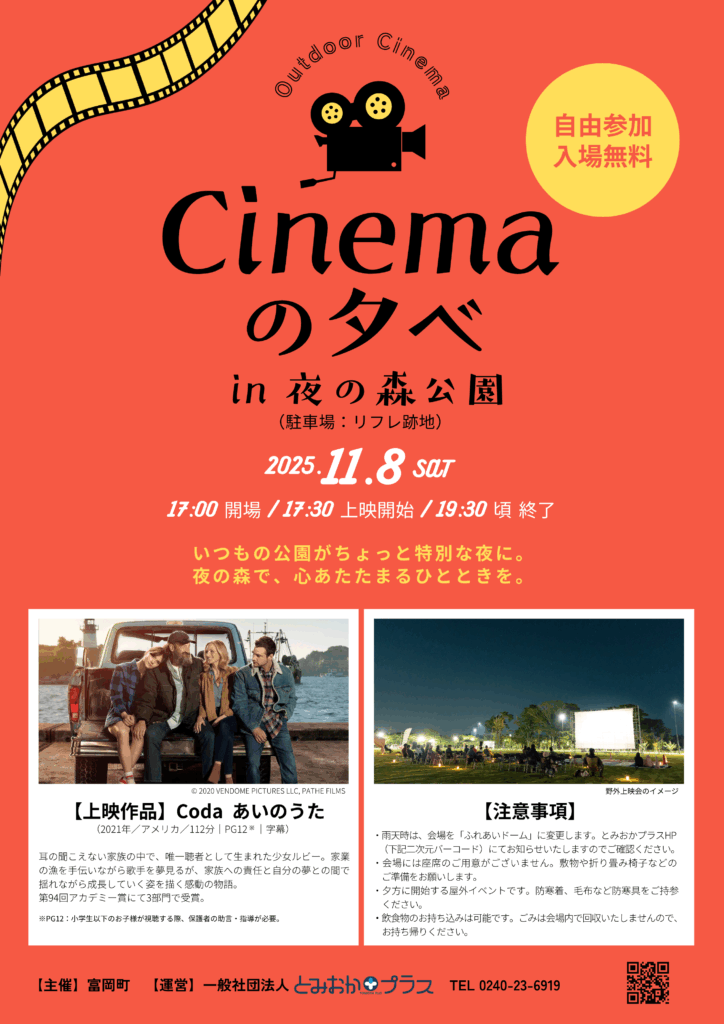 いつものの公園が、映画館に変わる日。風の音も、星の瞬きも、まるごと映画の一部に。夜の森で、心あたたまるひとときを過ごしませんか。