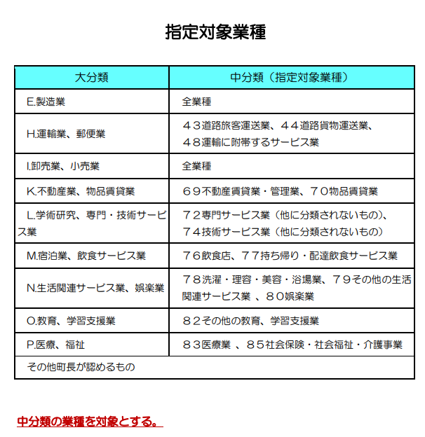 以下の(1)および(2)に該当し、かつ町が(3)で指定する業種であること。