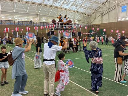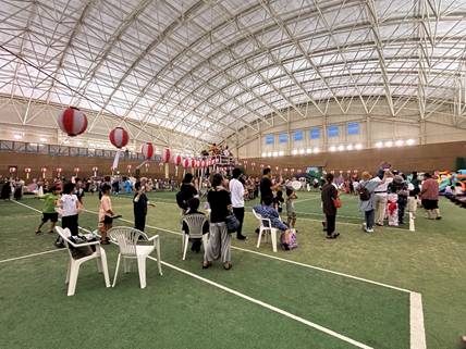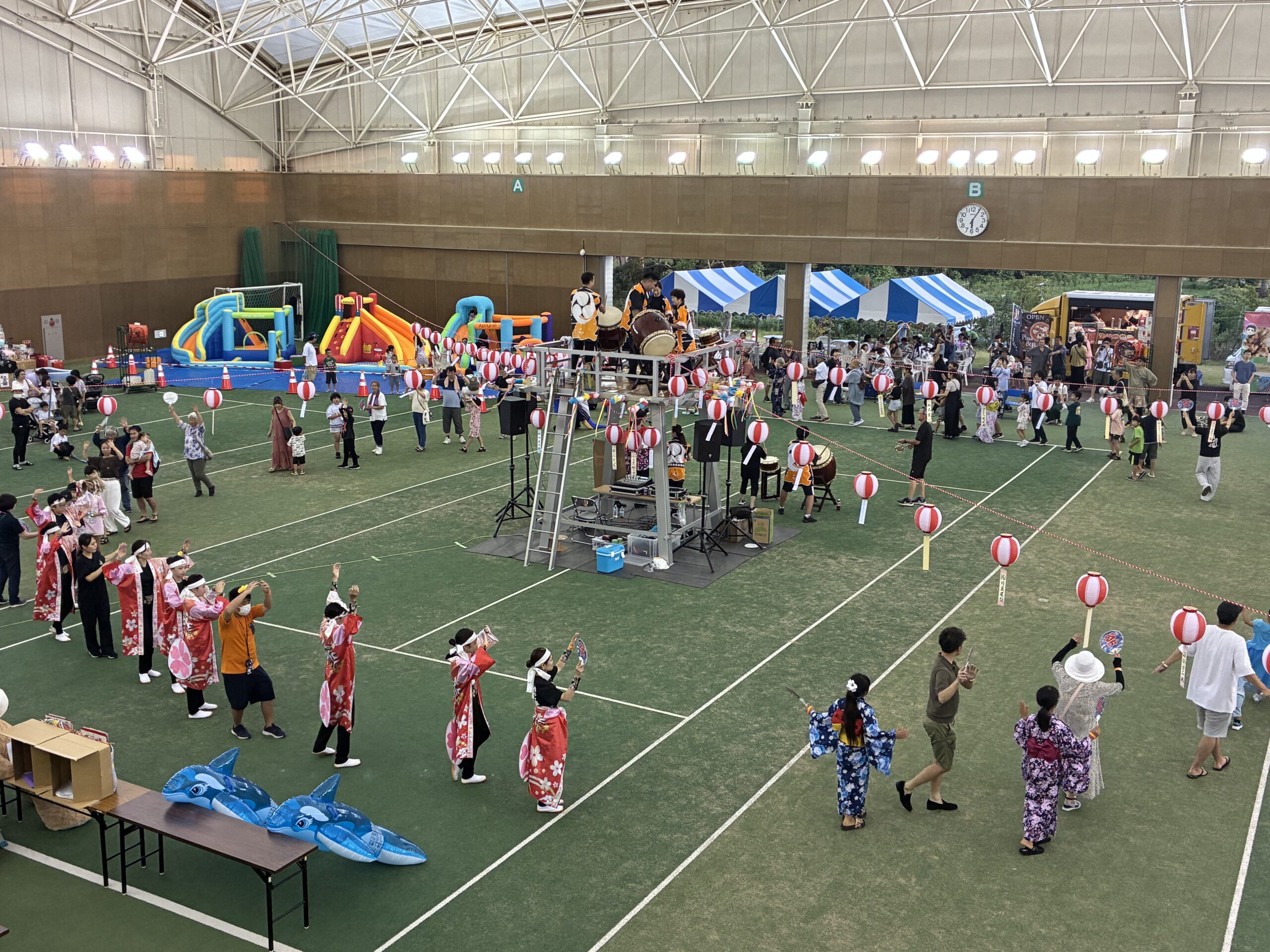 会場は富岡ふれあいドームで、屋根があるので全天候型で雨を気にせず楽しめます。この日の天気は良かったのですが、前週の週末は大雨だったこともあり、こういった会場での盆踊りは天気予報に気を揉むことなく当日を迎えられるので良いですね。