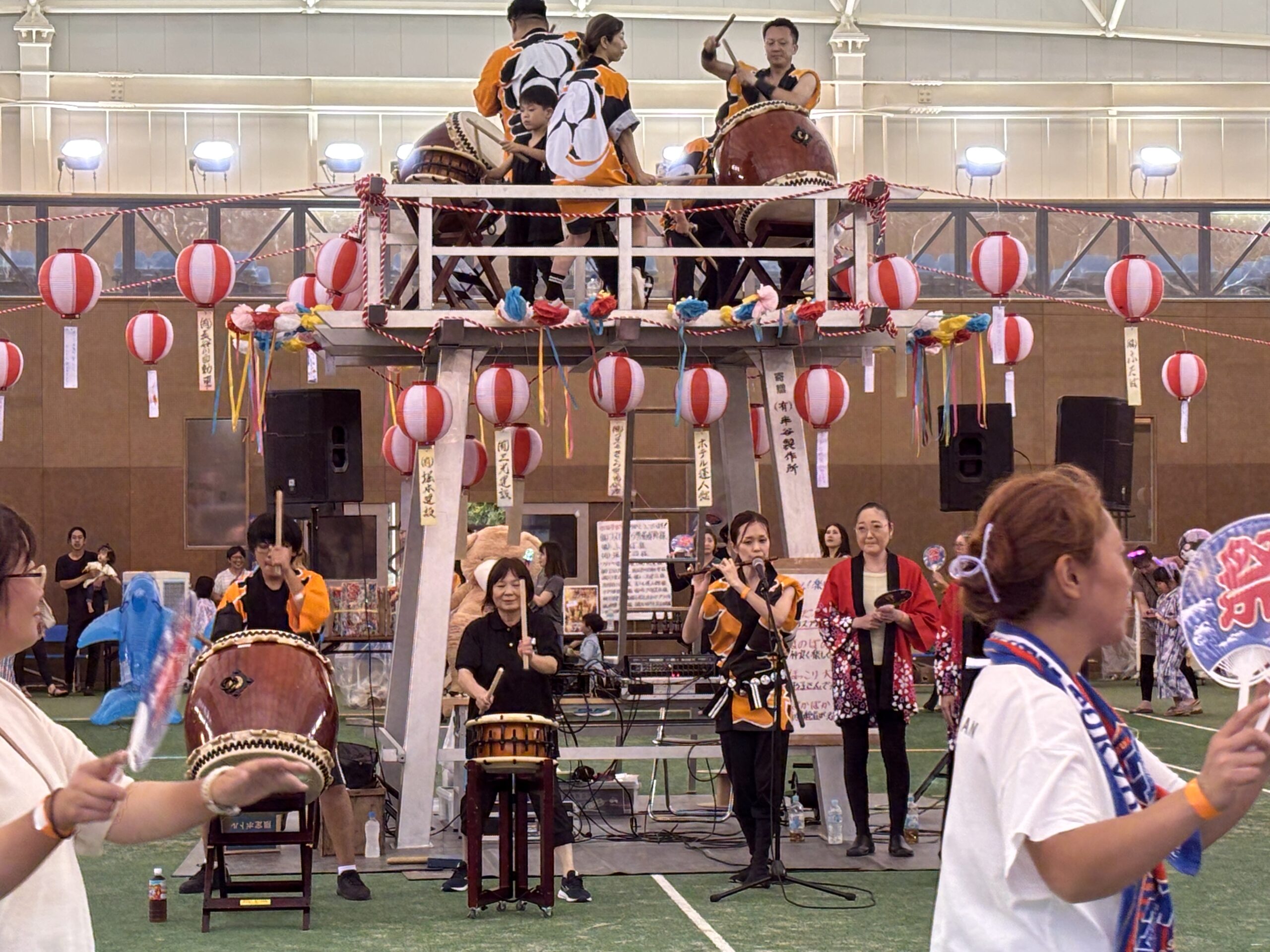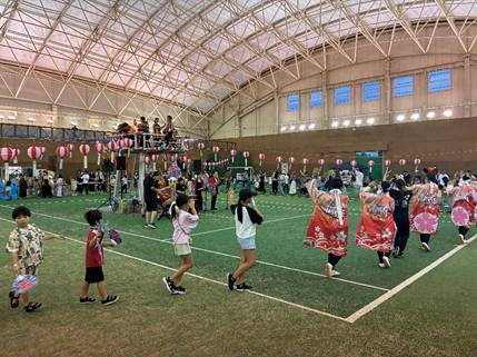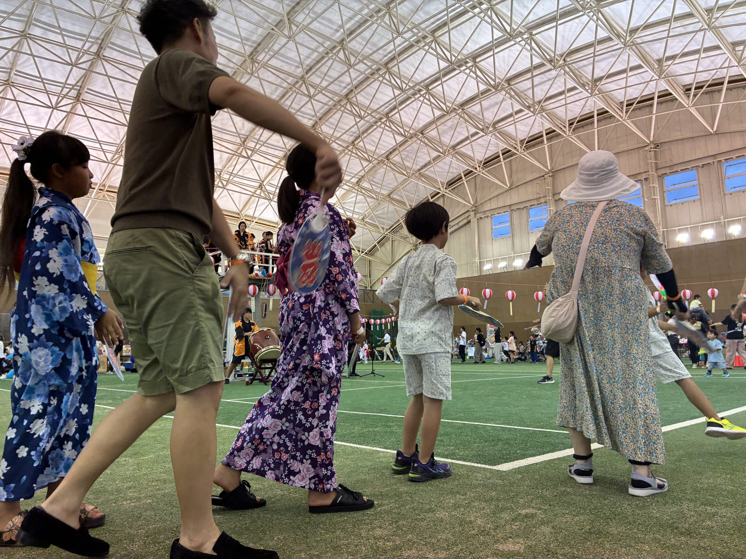 夕方から盆踊りでしたが、一日を通して出店が並んでいたり、よさこいや太鼓などの演舞・演奏、飛行機飛ばしバトルなど子どもも楽しめるイベントが開かれていたようです。