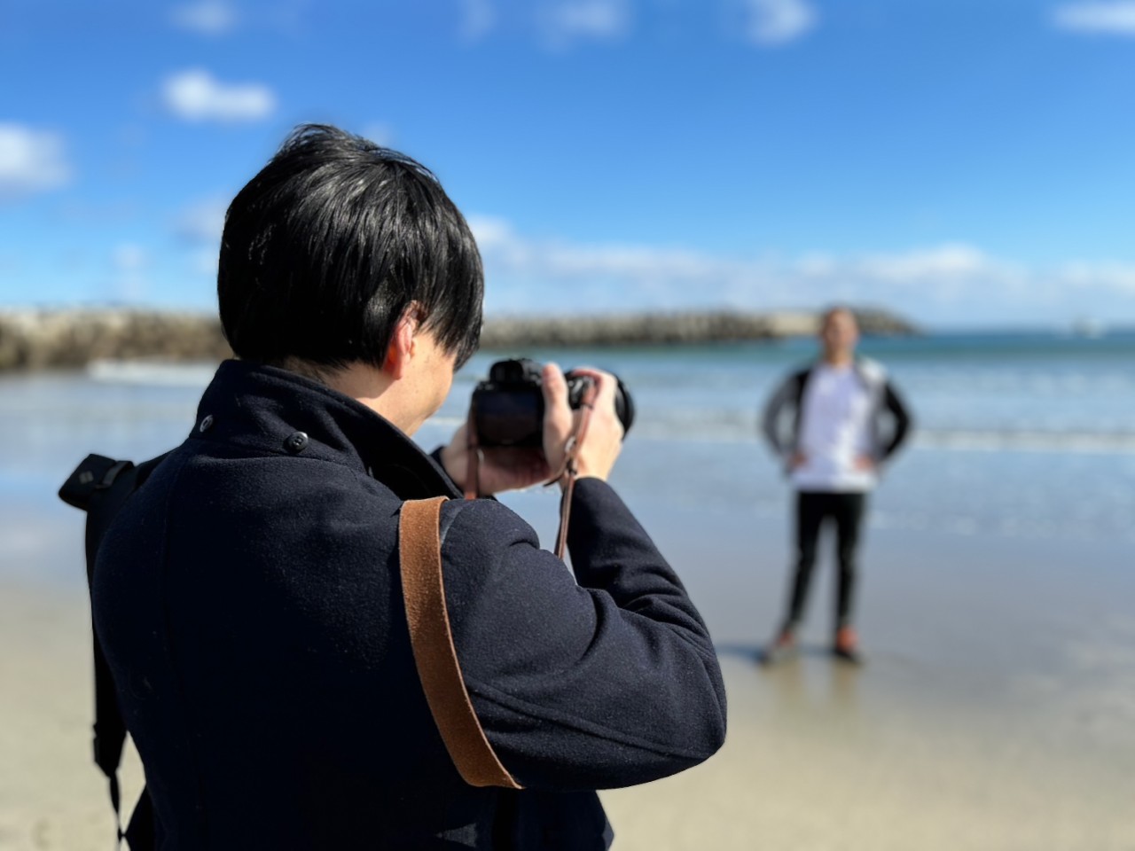 外での撮影を希望される方には、海での撮影を提案しています。海沿いはとても綺麗で気持ちよく、自分も好きな場所なんです。自然が豊かなので撮影場所として使える場所も多いですよね。本当に浜通りならではのいい所だと思います。時間がゆっくり感じられるのも、私には合っていると感じます。東京で生活していたこともありますが、都会の喧騒が苦手な人には、静かでゆったりした富岡町は住みやすいんじゃないでしょうか。